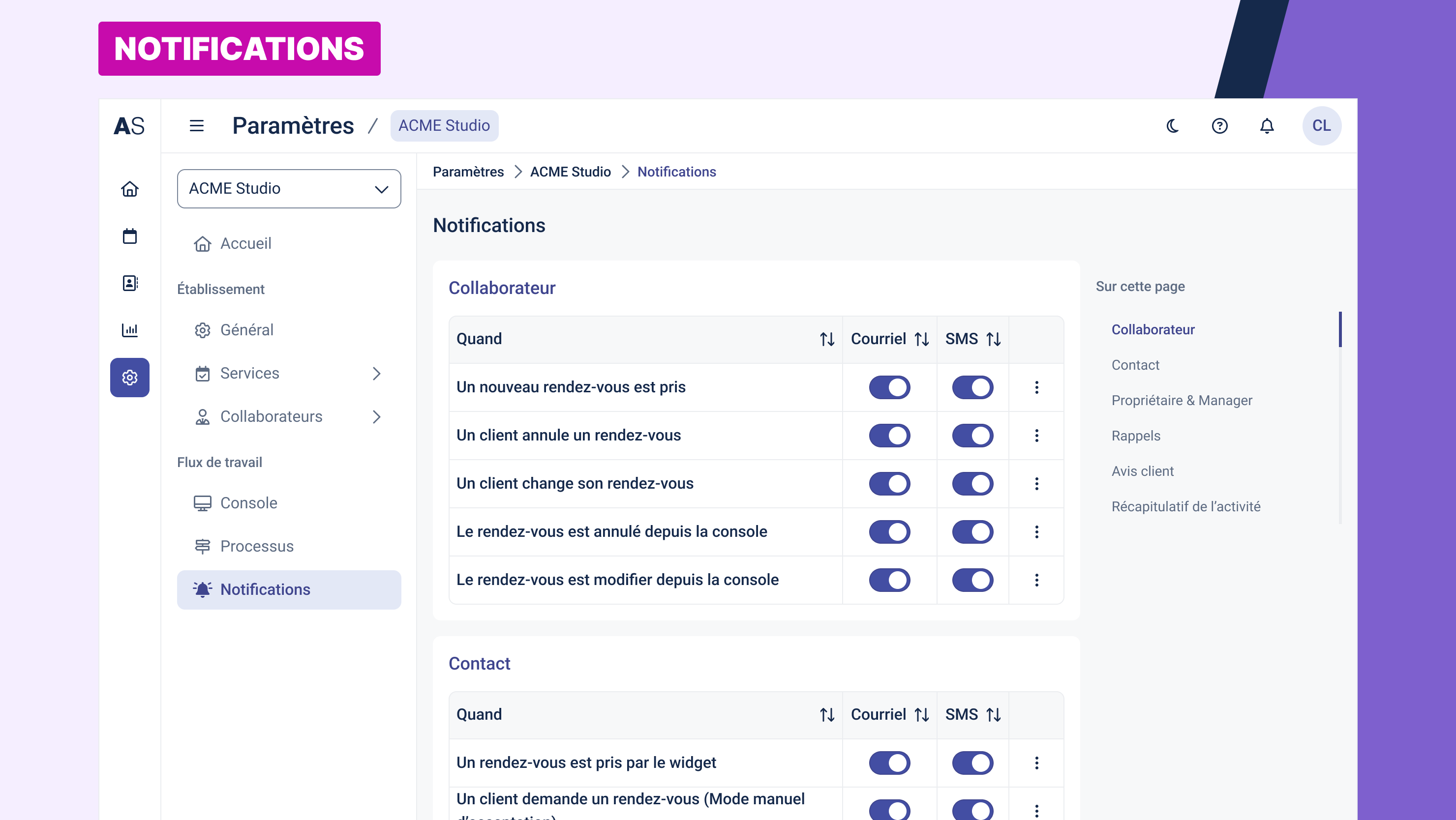 The Notifications page allows you to configure automated messages sent to different participants (clients, staff, managers) based on events related to appointments. You can define the communication channel (email or SMS), the triggering event, and the recipients.