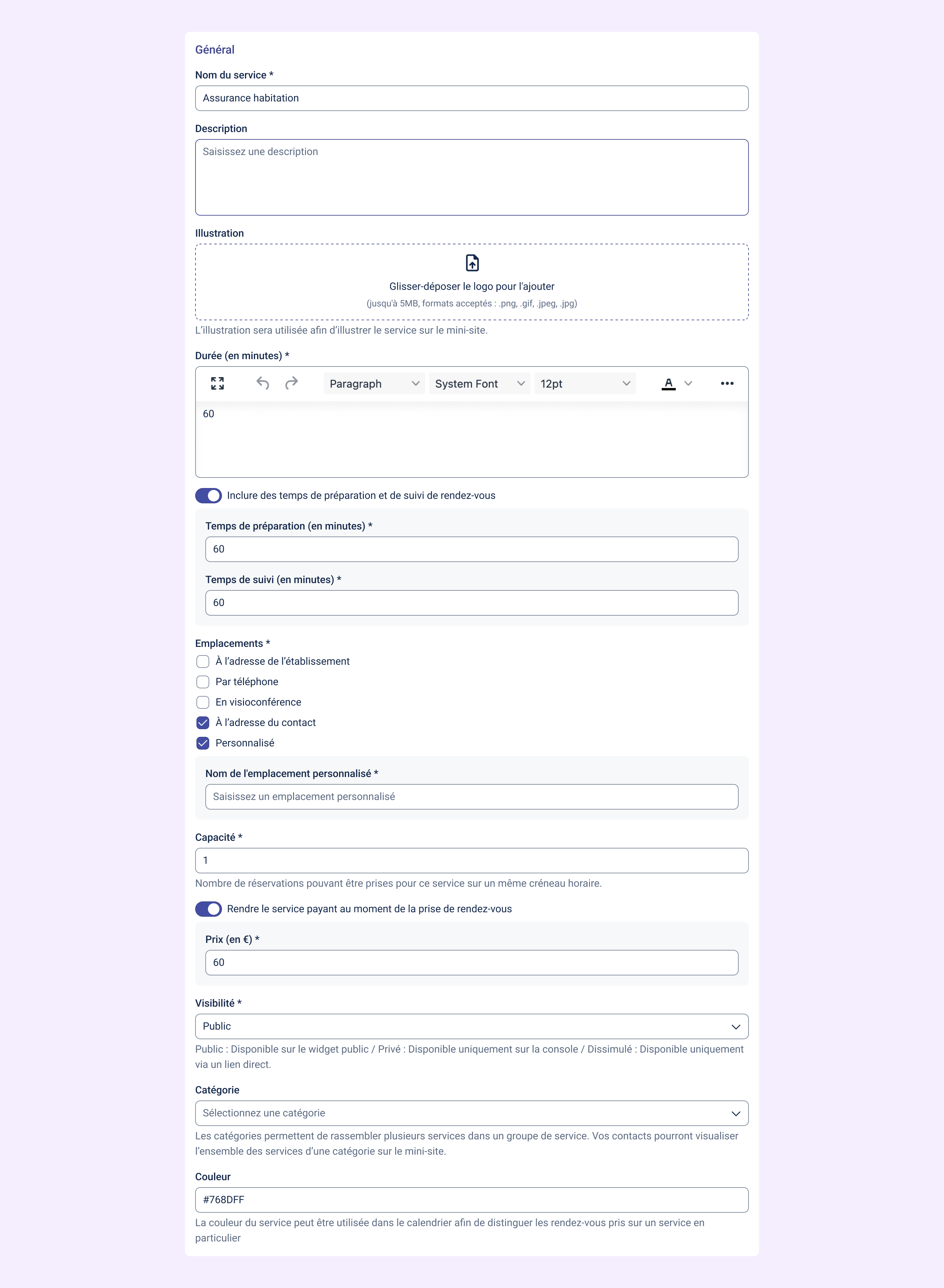- Délai d’annulation : ex. : minimum 24h avant le rendez-vous
