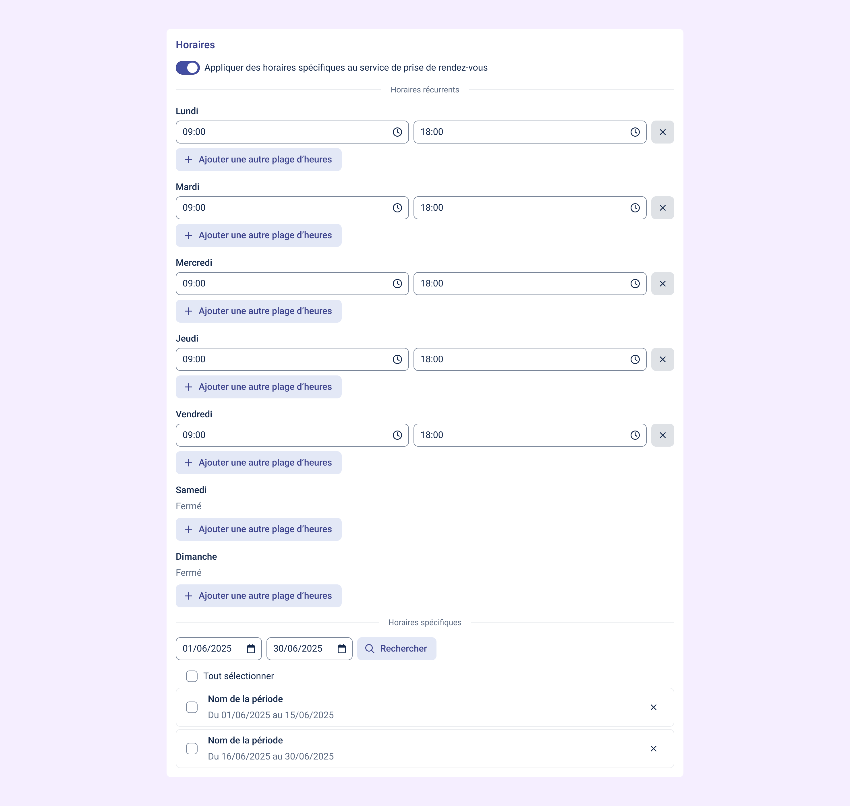 - Périodes actives : le service n’est proposé que pendant certaines plages