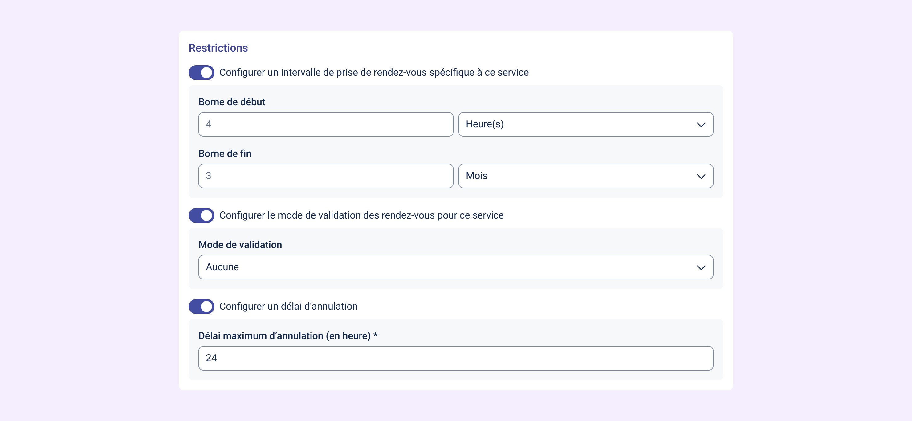 - Délai de réservation : ex. : min. 4h avant, max. 3 mois à l'avance