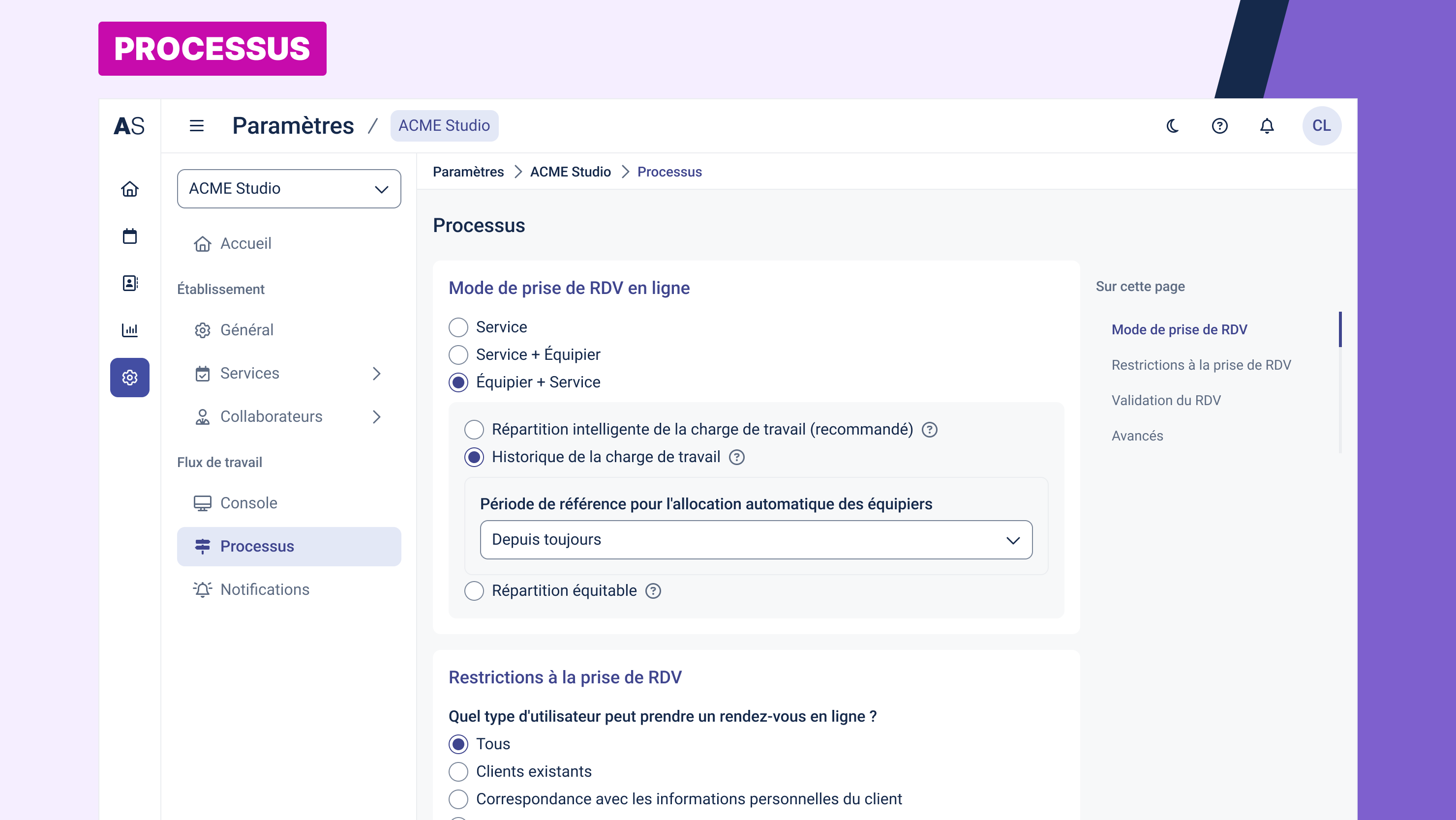 La section Processus vous permet de définir les règles de fonctionnement liées à la prise de rendez-vous en ligne : attribution des collaborateurs, prise en compte des déplacements, restrictions d'accès à la réservation, validation des rendez-vous, etc.